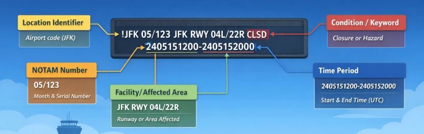 All NOTAMs follow a specific format, which includes several required elements.